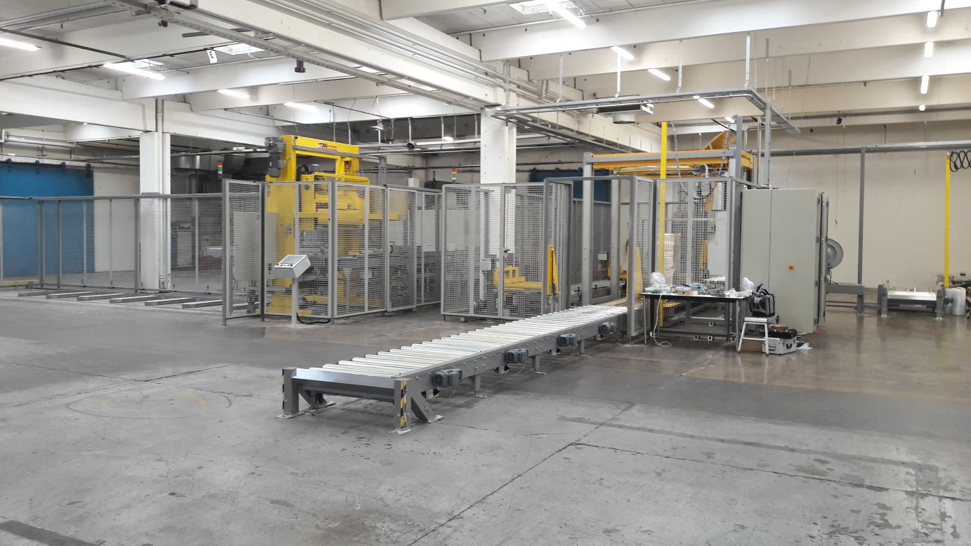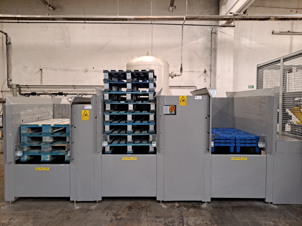 De-palletering med 7 positioner, samt tompaller. Kan udbygges.