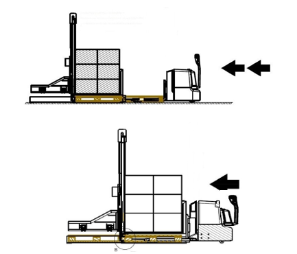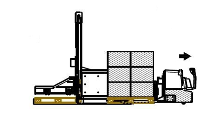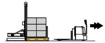 så trucken kan køre indtil stakken med paller. Operatøren kan nu køre stakken med paller ud.